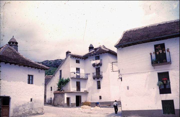 De nuevo una imagen en color tomada el 7 de julio de 1960 , en ésta ocasión de la esquina de la Plaza de la Fuente con la calle Aire. Podemos contemplar a la izquierda Casa La Rufa, en medio Casa Canteré y a la derecha Casa Blasquico, que ya era fonda, en aquellos años. La imagen , como la que publiqué en el blog hace dos semanas, se encuentra en los Archives Départamentales de la Haute-Garonne (Francia). La novedad es que he localizado al autor de las imágenes, que fue Jean Sermet, hispanista, profesor de geografía e historia de la Universidad de Toulouse, ciudad donde nació en 1907 y falleció en 2003. Con numerosas obras publicadas, su obra más conocida y publicada en nuestro país fue La España del Sur, fruto de un viaje realizado en el año 1953. A continuación , una imagen tomada por mí hace unos días del mismo sitio, tal como se encuentra actualmente. En próximas entradas seguiré subiendo más imágenes tomadas por Sermet en el Valle de Echo.